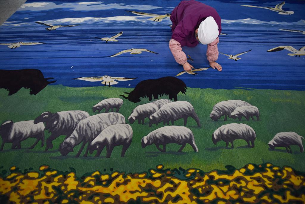 2023年2月21日,在西寧市圣源地毯集團生產(chǎn)車間,操作工檢查毯面、拔花刺。新華社記者吳剛攝