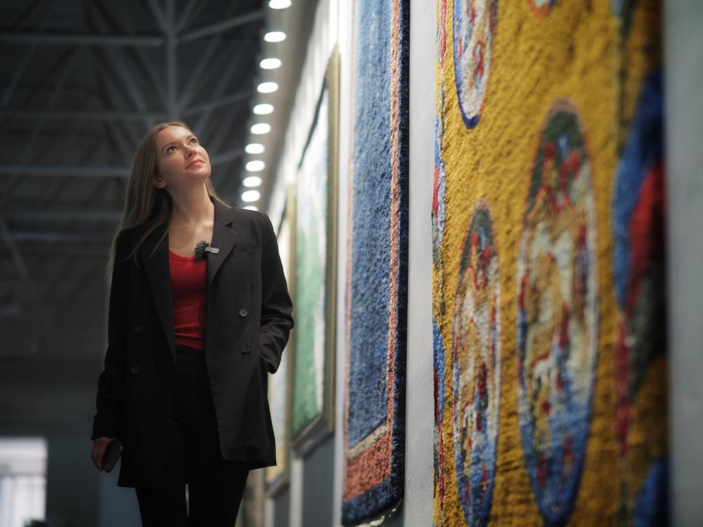 2024年3月20日,新華社外籍記者達莎在西寧市圣源地毯集團生產(chǎn)車間參觀。新華社記者趙宇攝