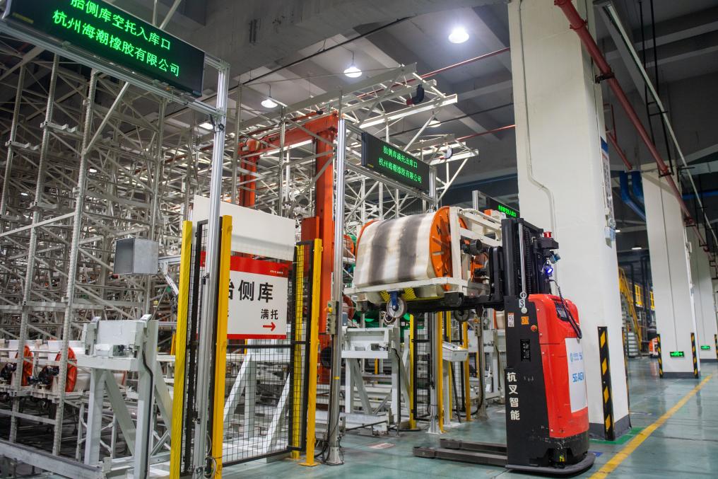 在杭州市錢塘區(qū)中策橡膠集團(tuán)股份有限公司未來工廠內(nèi),無人叉車在運輸產(chǎn)品(2024年2月23日攝)。新華社記者 江漢 攝