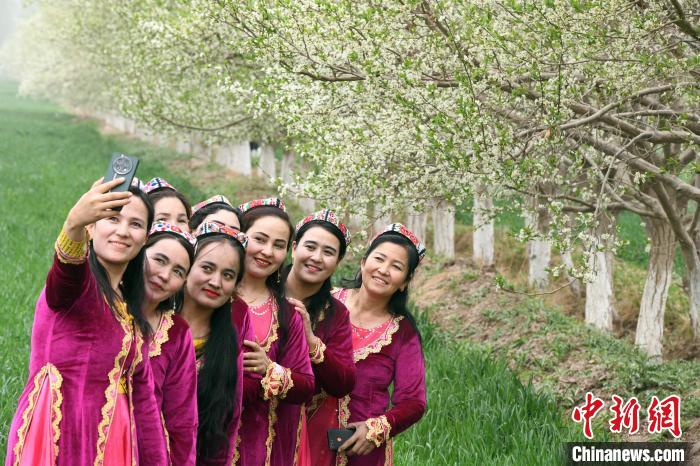 4月15日,新疆伽師縣舉行第四屆新梅花開文學(xué)藝術(shù)采風(fēng)活動。圖為新疆伽師縣米夏鄉(xiāng)的民眾在新梅花前自拍。中新網(wǎng)記者孫亭文攝