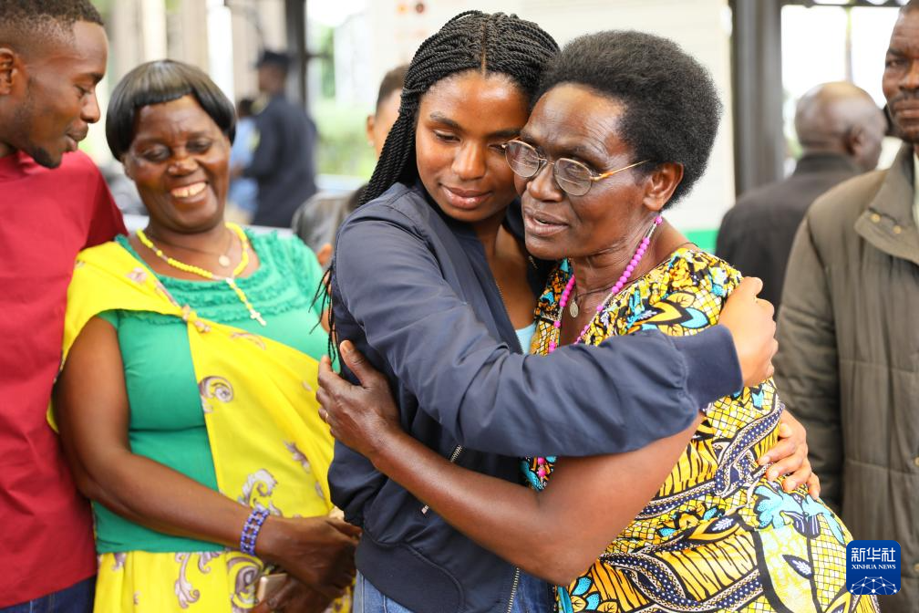 4月23日,在盧旺達首都基加利國際機場,一名來自盧旺達北方省穆桑澤職業(yè)技術(shù)學院的學生與母親擁抱告別。新華社記者 吉莉 攝