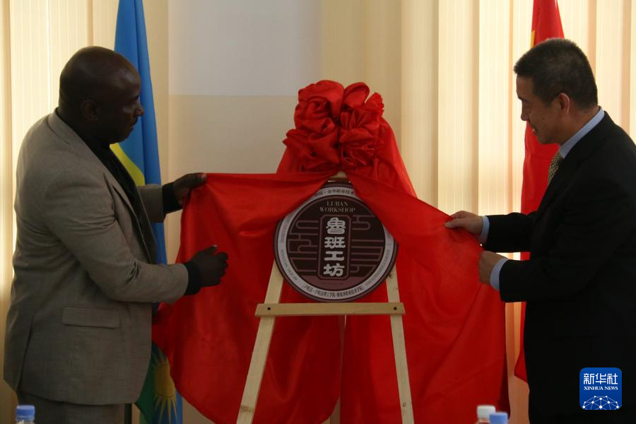 2023年11月18日,在盧旺達北方省穆桑澤職業(yè)技術(shù)學院,中國駐盧旺達大使王雪坤(右)與盧旺達北方省省長莫里斯·穆加博瓦加洪德共同為盧旺達魯班工坊揭牌。新華社發(fā)(黃萬晴攝)