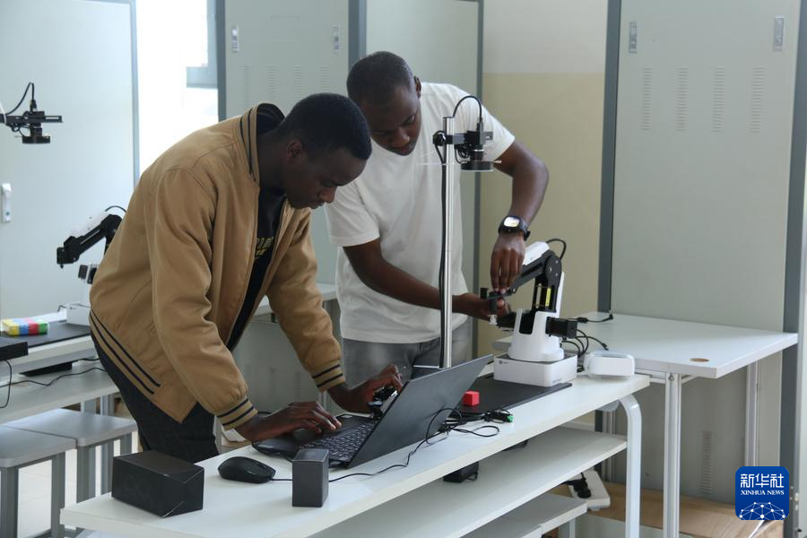 2023年11月18日,在盧旺達北方省穆桑澤職業(yè)技術(shù)學院魯班工坊的實驗室中,兩名當?shù)貙W生操作儀器。新華社發(fā)(黃萬晴攝)