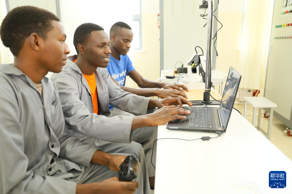 4月15日,在盧旺達北方省穆桑澤職業(yè)技術(shù)學院,學生通過電腦練習操作機械臂。新華社記者 吉莉 攝