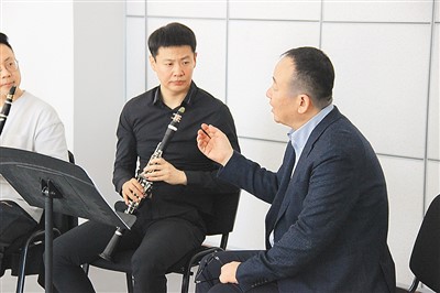 中國交響樂團副團長、單簧管首席尹波(右一)指導新疆藝術學院學生。