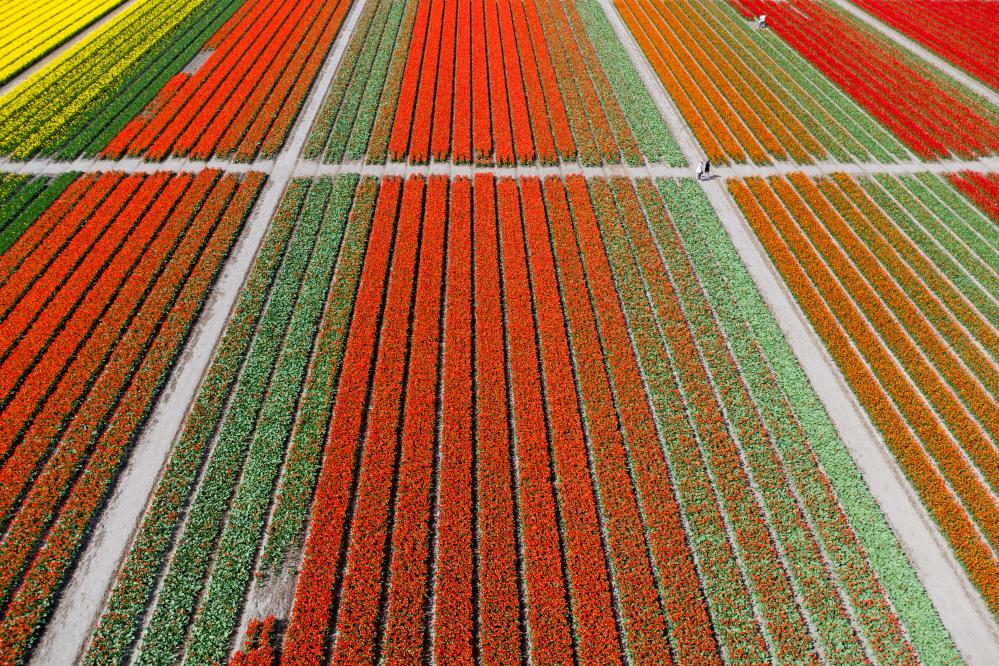 這是4月14日在荷蘭利瑟拍攝的郁金香花田(無(wú)人機(jī)照片)。新華社記者孟鼎博攝