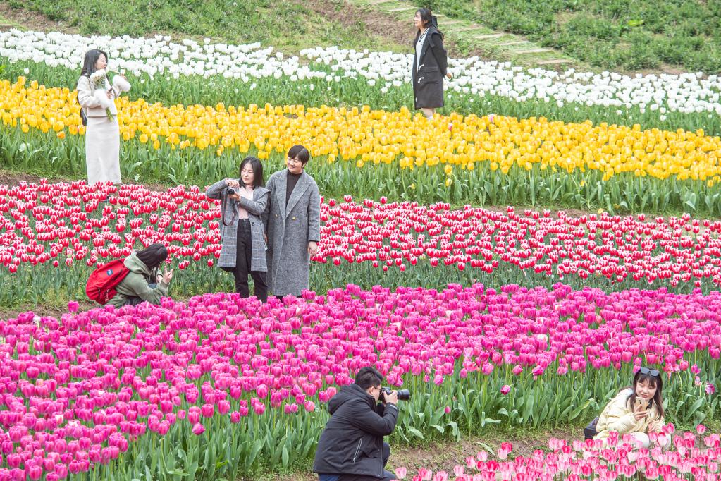 3月9日,在位于重慶市長(zhǎng)壽區(qū)的長(zhǎng)壽湖景區(qū),游客在郁金香花海中賞花拍照。景區(qū)今年一共從荷蘭進(jìn)口郁金香種球近60萬(wàn)粒,分三大系列27個(gè)品種,種植面積約12000平米。新華社記者唐奕攝