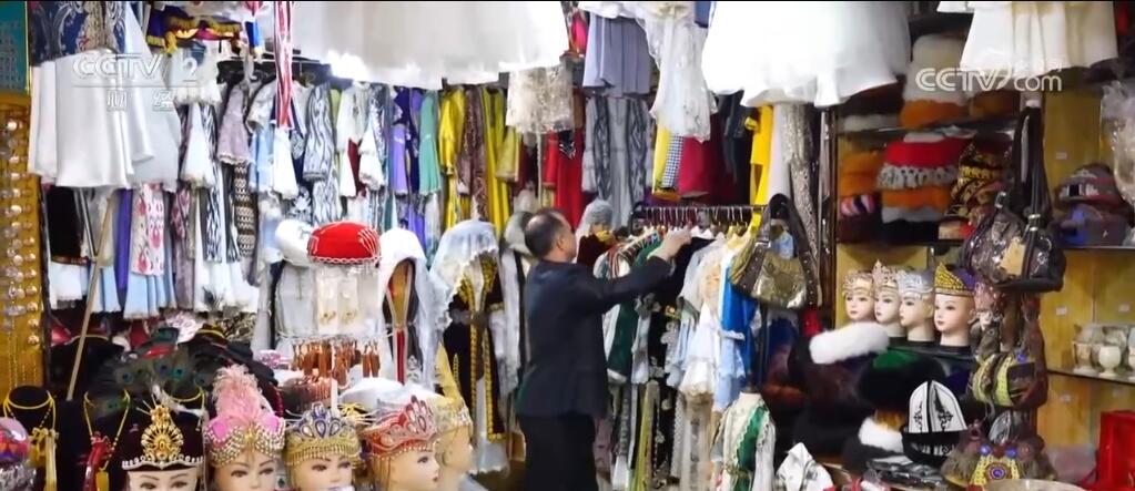 在總臺2024年春晚舞臺上,演員們身穿特色服飾進(jìn)行表演,驚艷全場。春晚過后,慕名前來購買和定制艾特萊斯服飾的游客不斷增加。努爾·買買提原本在當(dāng)?shù)亟?jīng)營一家數(shù)碼產(chǎn)品店鋪,看到旅拍店艾特萊斯服飾等傳統(tǒng)民族服裝的租賃和定制需求增加,他便在喀什古城開了一家民族服裝綜合店。