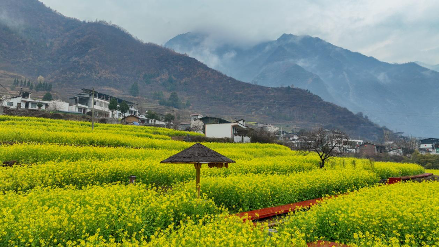 隴南市文縣玉壘鄉(xiāng)的油菜花海(無(wú)人機(jī)照片)。新華社記者 郎兵兵 攝