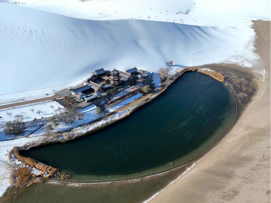 敦煌鳴沙山月牙泉景區(qū)雪景(無(wú)人機(jī)照片)。新華社發(fā)(張曉亮 攝)