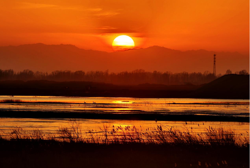 甘肅省武威市民勤縣紅崖山水庫(kù)在晚霞的映襯下分外美麗。新華社發(fā)