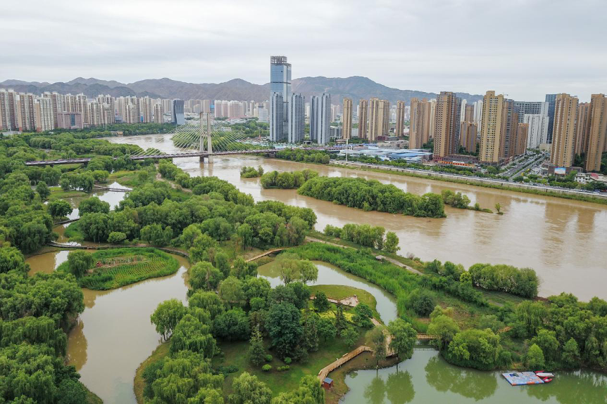 甘肅省蘭州市拍攝的銀灘濕地公園景色(無(wú)人機(jī)照片)。新華社記者 范培珅 攝