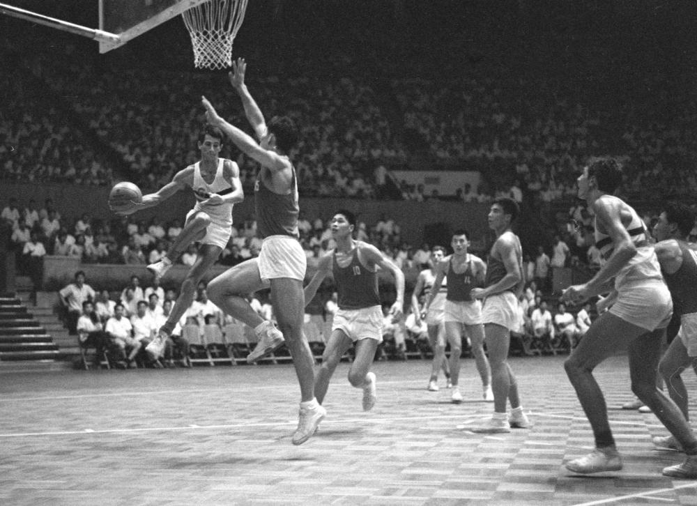 ↑1966年7月31日,法國男子籃球隊同中國男子籃球隊在北京工人體育館進行訪華首場友誼賽。