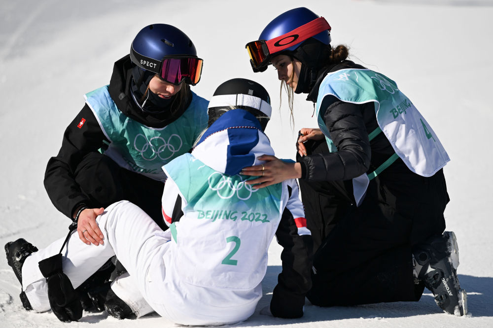 ↑2022年2月8日,中國選手谷愛凌(右)和瑞士選手瑪?shù)贍柕隆じ窭啄拢ㄗ螅┰诒本?022年冬奧會自由式滑雪女子大跳臺決賽后安慰法國選手泰絲·勒德。奧運賽場外中法體育界展開多領域交流與合作2011年6月法網賽場上演中國奇跡29歲的中國姑娘李娜成為第一個奪得網球大滿貫賽事單打冠軍的亞洲人
