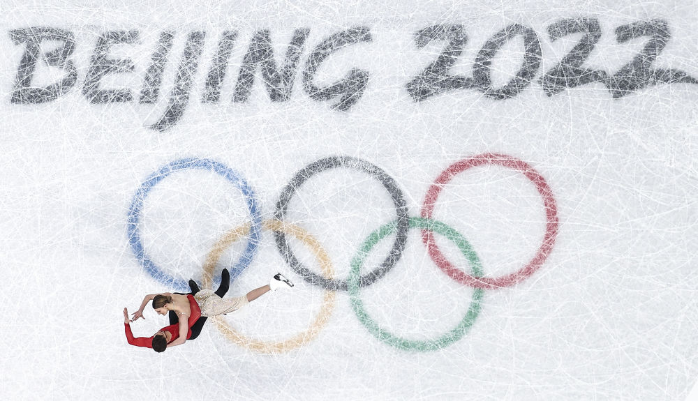 ↑2022年2月14日,法國選手加布麗埃拉·帕帕達基斯(上)和紀堯姆·西澤龍在北京2022年冬奧會花樣滑冰冰上舞蹈比賽中,他們最終奪得該項目冠軍。