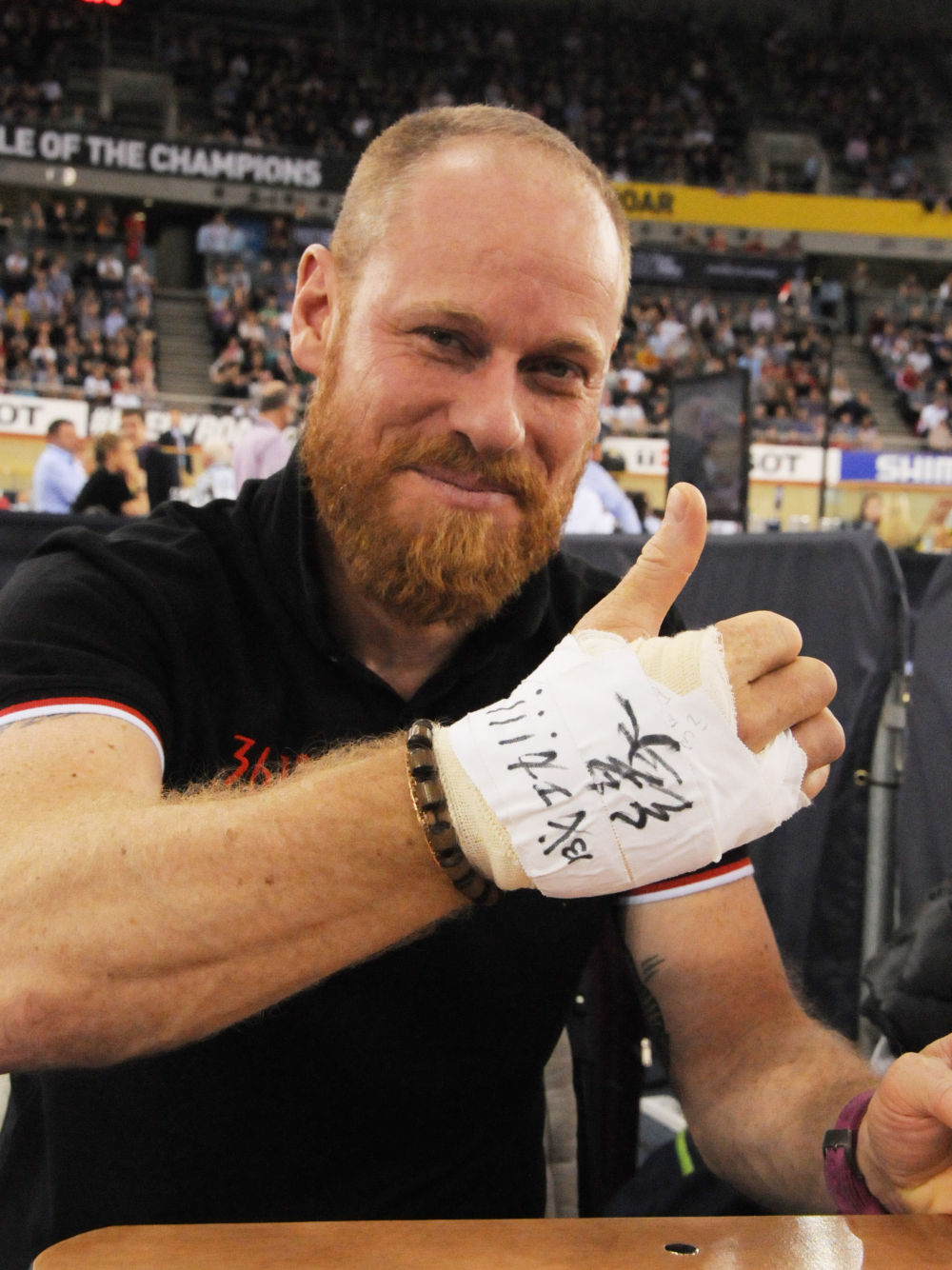 ↑2016年3月6日,2016場地自行車世錦賽賽場上,中國隊的法國籍教練韋蒂展示右手繃帶上的漢字“成功!??!緣”。
