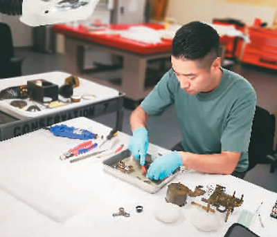 修復工作要通過拆解清洗,再拋光打磨,修復完以后組裝調試。“火車頭古鐘表最繁瑣的就是調試,我們用了一周多時間,反復多次才把火車輪和連桿之間的位置、角度調整到最佳。這樣火車頭在上發(fā)條后才能順滑運轉。”亓昊楠說。