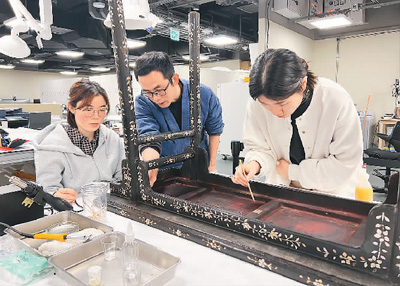 在修復漆器的基礎上疊加螺片的修復與鑲嵌,修復難度又提高了。梁嘉放說,漆器修復的實際操作很復雜,原文物用漆的成分、刷漆方法、天氣情況對漆的影響等因素,都是儀器無法探及的。