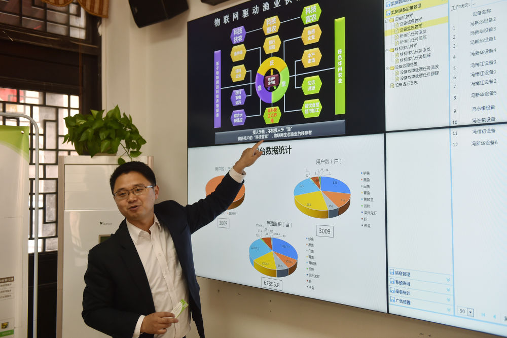 “漁博士”沈杰在浙江省湖州市菱湖鎮(zhèn)創(chuàng)辦的公司內(nèi)介紹匯集養(yǎng)殖戶、飼料廠商、銷售檔口、金融機構(gòu)等相關(guān)方的物聯(lián)網(wǎng)平臺(資料照片)。