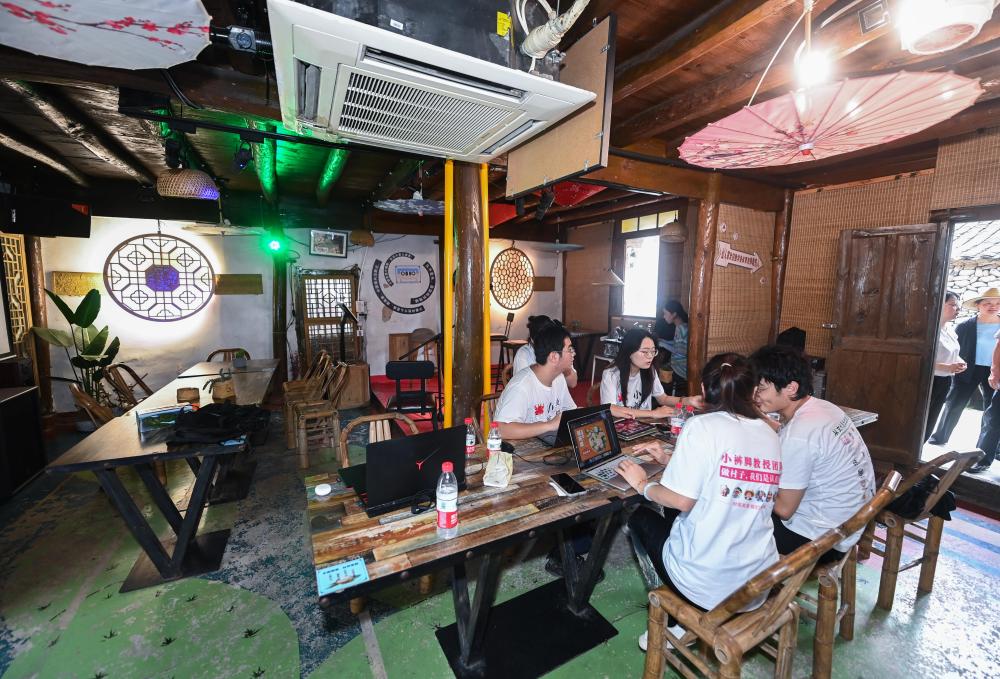2023年8月11日,高校藝術(shù)院系的大學生們在寧波市寧海縣葛家村的特色酒吧內(nèi)討論村落藝術(shù)改造提升的設(shè)計方案。 新華社記者 徐昱 攝