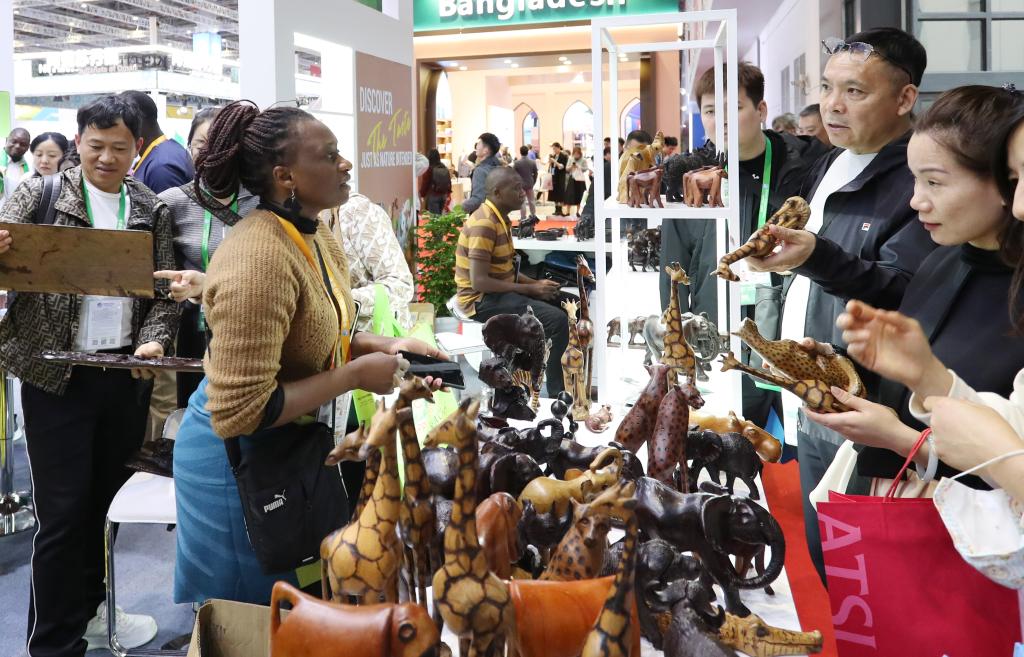 2023年11月6日,來自津巴布韋的艾薇頓絲·察卡瓦在展臺(tái)向參觀者介紹木雕展品。這是她第一次來到中國上海參加進(jìn)博會(huì),這些木雕都是她的哥哥在家里制作的,她想通過進(jìn)博會(huì)為哥哥的木雕作品找到好的銷路。新華社記者方喆攝