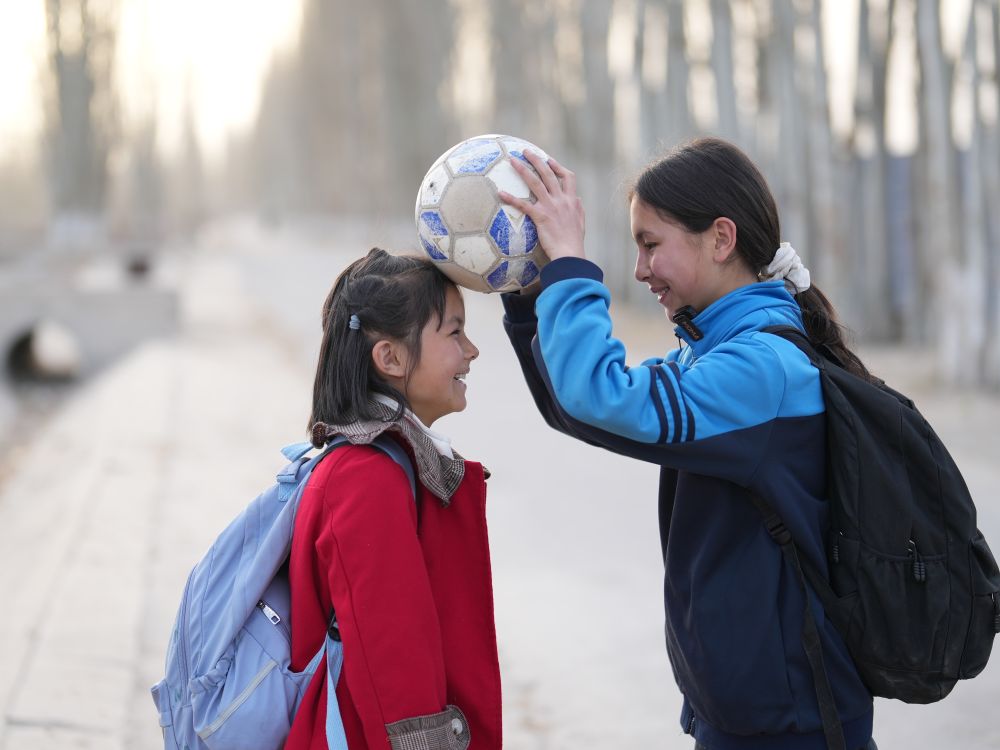 “我的紙飛機(jī)呀飛呀飛,飛到了蘆蕩邊。帶我去看落日晚霞,還有開滿花的田野……”姐妹倆給水指導(dǎo)唱了她們學(xué)過的歌。水指導(dǎo)給她們送了嶄新的足球,勉勵(lì)她們要好好踢球,也要好好學(xué)習(xí)。