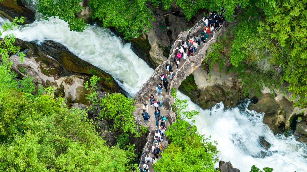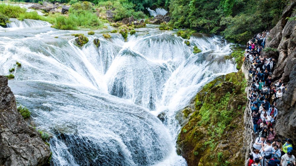 5月2日,游客在貴州省安順市天星橋景區(qū)游覽(無人機(jī)照片)。新華社發(fā)(陳熙 攝)