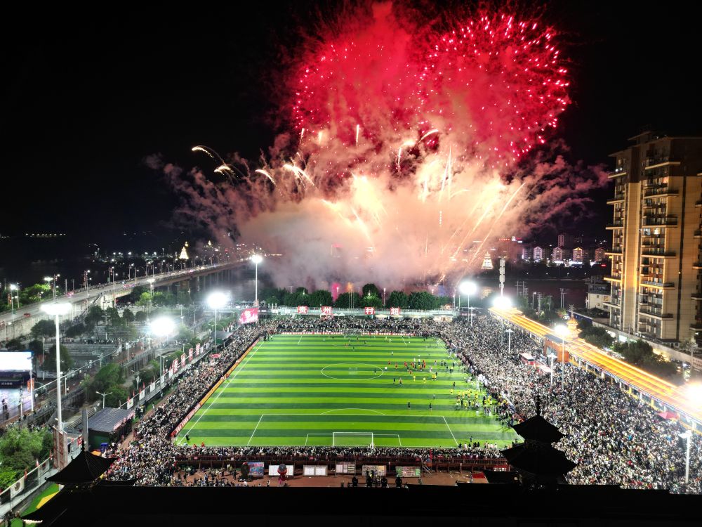 5月4日,游客在貴州省黔東南苗族侗族自治州榕江縣“村超”球場(chǎng)比賽結(jié)束后欣賞焰火表演(無人機(jī)照片)。新華社發(fā)(王炳真 攝)