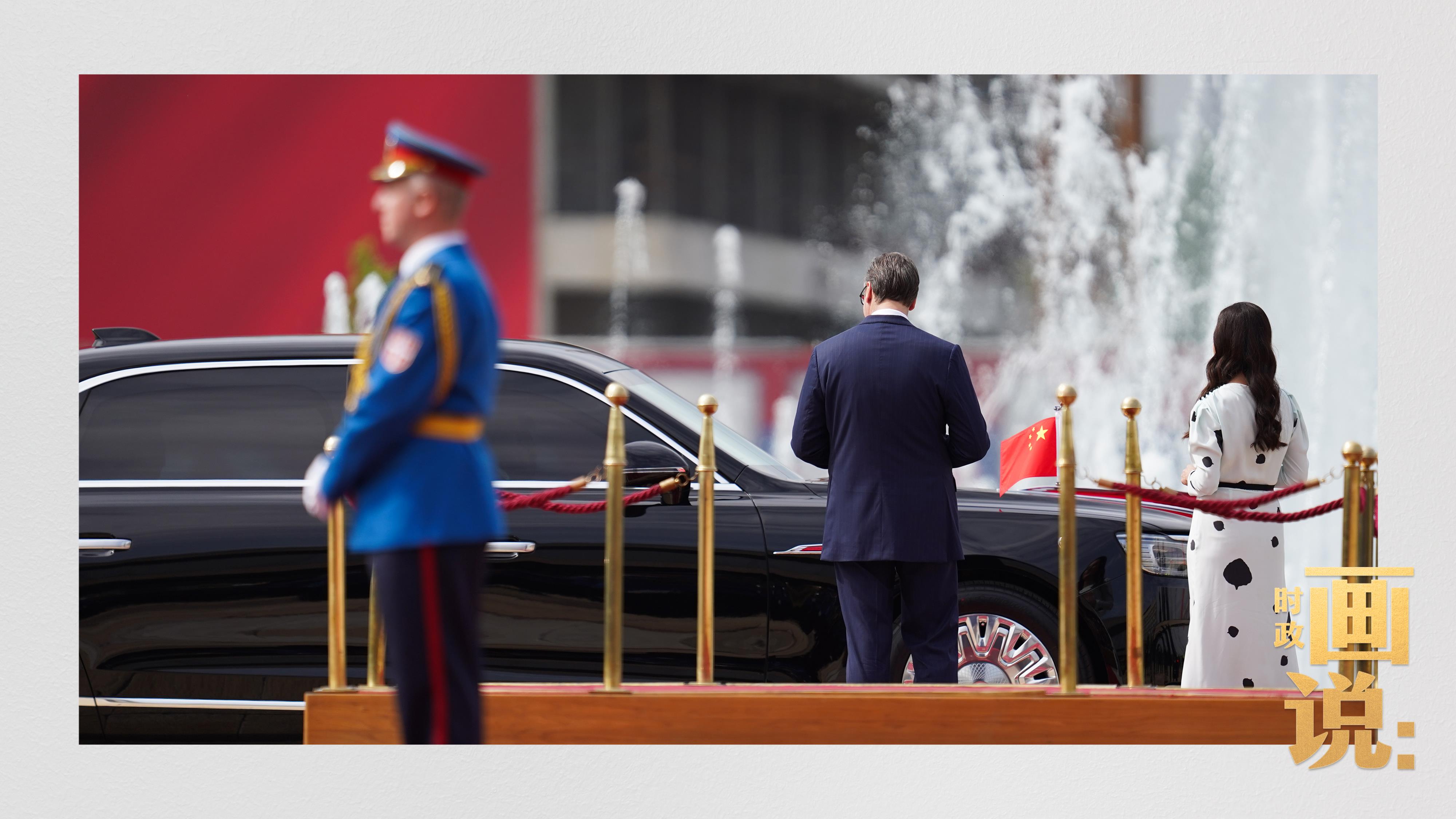 塞爾維亞大廈前廣場,塞爾維亞總統(tǒng)武契奇和夫人塔瑪拉在下車處熱情迎接習(xí)近平和夫人彭麗媛。