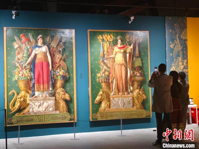 4月13日,觀眾拍攝掛毯模板,左圖為“亞細(xì)亞”,右圖為“歐羅巴”。 蘇婧欣 攝