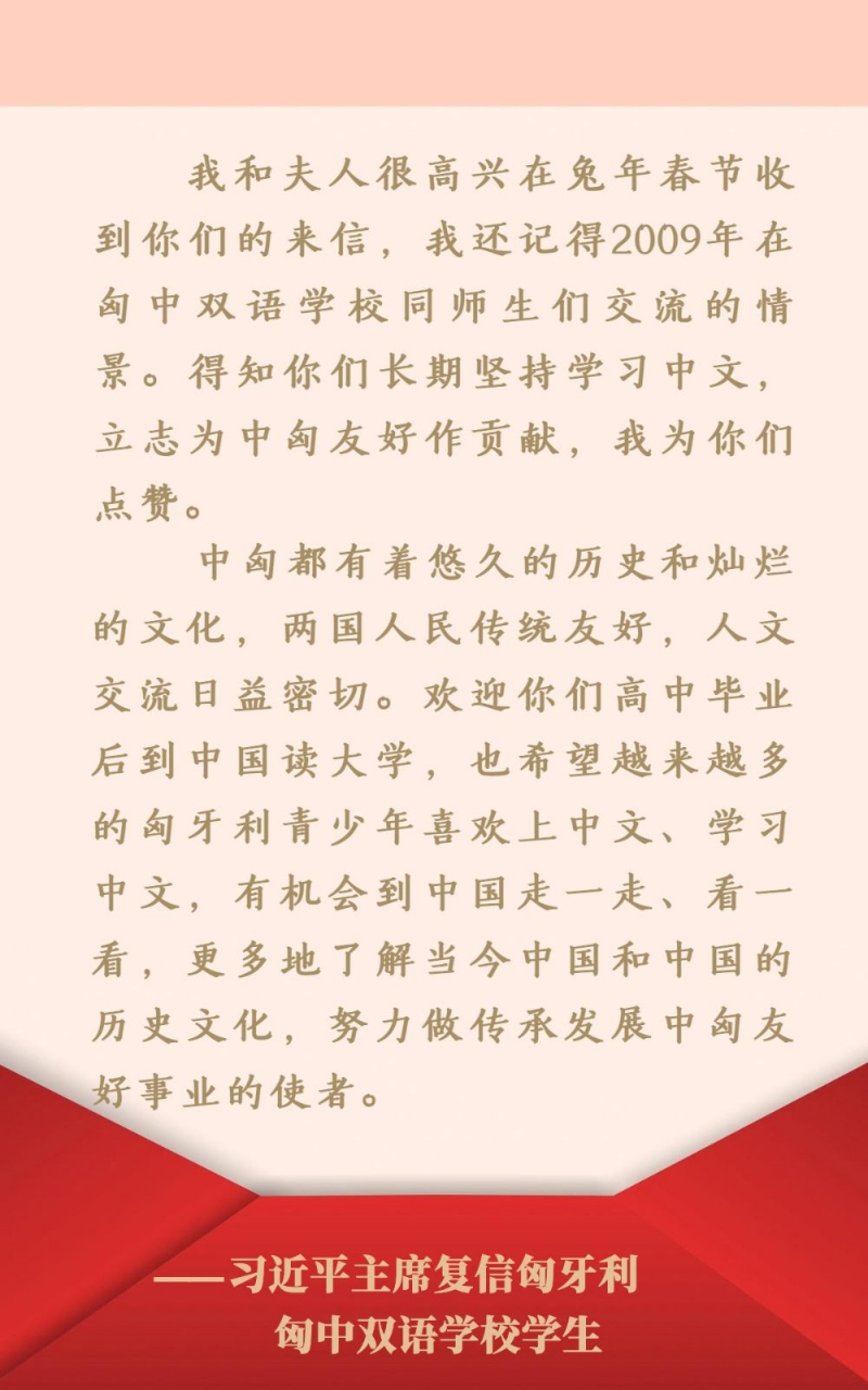 習近平主席在復信中鼓勵匈牙利青少年更多了解中國,做傳承發(fā)展中匈友好事業(yè)的使者。這封情真意切的回信,令匈中雙語學校師生倍感溫暖和鼓舞。