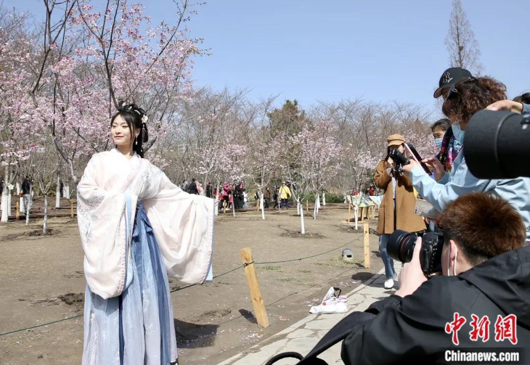 2021年北京玉淵潭公園春季賞花文化活動(dòng)在春分節(jié)氣開(kāi)幕,一名穿漢服的游客在櫻花樹(shù)前拍照。易海菲 攝