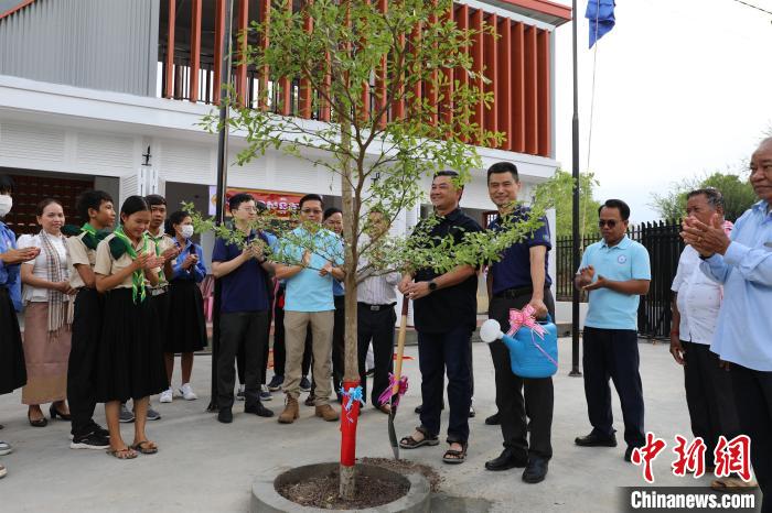當(dāng)?shù)貢r間5月12日,在距離金邊以南約60公里的一個擁有125戶家庭、500余人口的小鄉(xiāng)村,柬埔寨民間社會組織聯(lián)盟論壇主席蓋里維希揮鏟添泥,中國和平發(fā)展基金會駐柬埔寨辦事處主任劉戰(zhàn)國提壺澆水,合力種植下一棵象征著中柬友誼的隆都花樹。