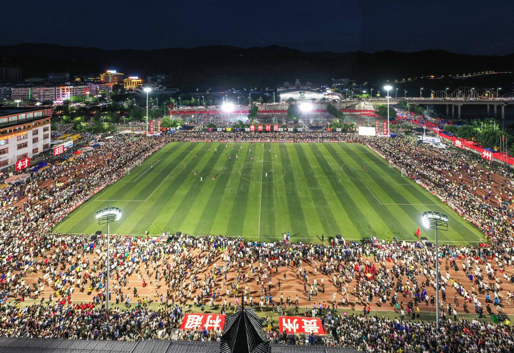 2023年7月1日,人們?cè)谟^看貴州“村超”足球賽(無(wú)人機(jī)照片)。新華社記者楊文斌攝