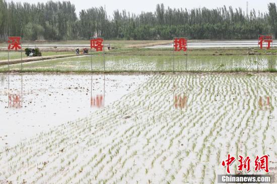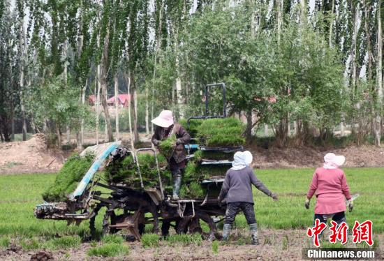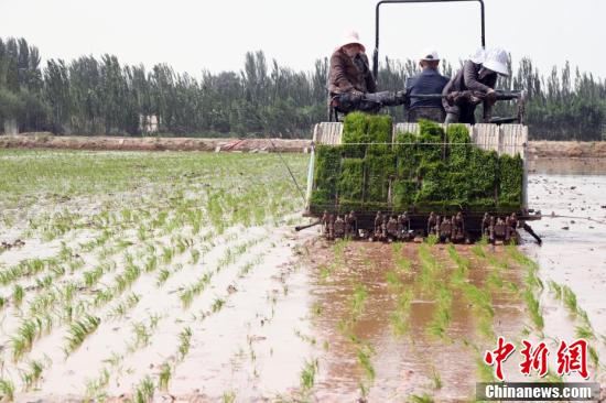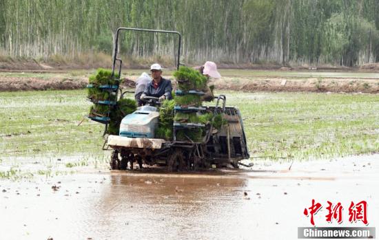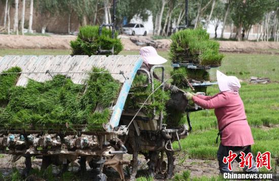 5月13日,在位于該市帕哈太克里鄉(xiāng)的“海水稻”種植基地,各類機械和工作人員都忙碌起來,搶抓農時進行“海水稻”播種工作。隨著氣溫回升,新疆喀什市的1.3萬畝“海水稻”進入插秧期。圖為工作人員駕駛著插秧機,搶抓農時進行“海水稻”播種工作。