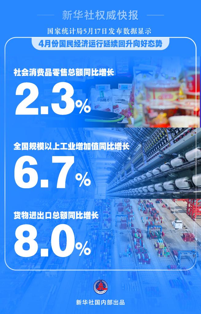 “總的來看,4月份國民經(jīng)濟(jì)運(yùn)行平穩(wěn),雖然部分指標(biāo)受節(jié)假日錯月、上年同期基數(shù)較高等因素影響增速有所放緩,但工業(yè)、出口、就業(yè)、物價等主要指標(biāo)總體改善,新動能保持較快成長,國民經(jīng)濟(jì)延續(xù)回升向好態(tài)勢,積極因素累積增多?!眹医y(tǒng)計局新聞發(fā)言人劉愛華在當(dāng)日舉行的國新辦發(fā)布會上說。