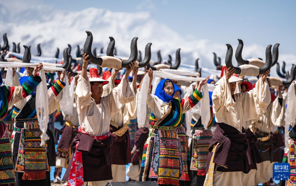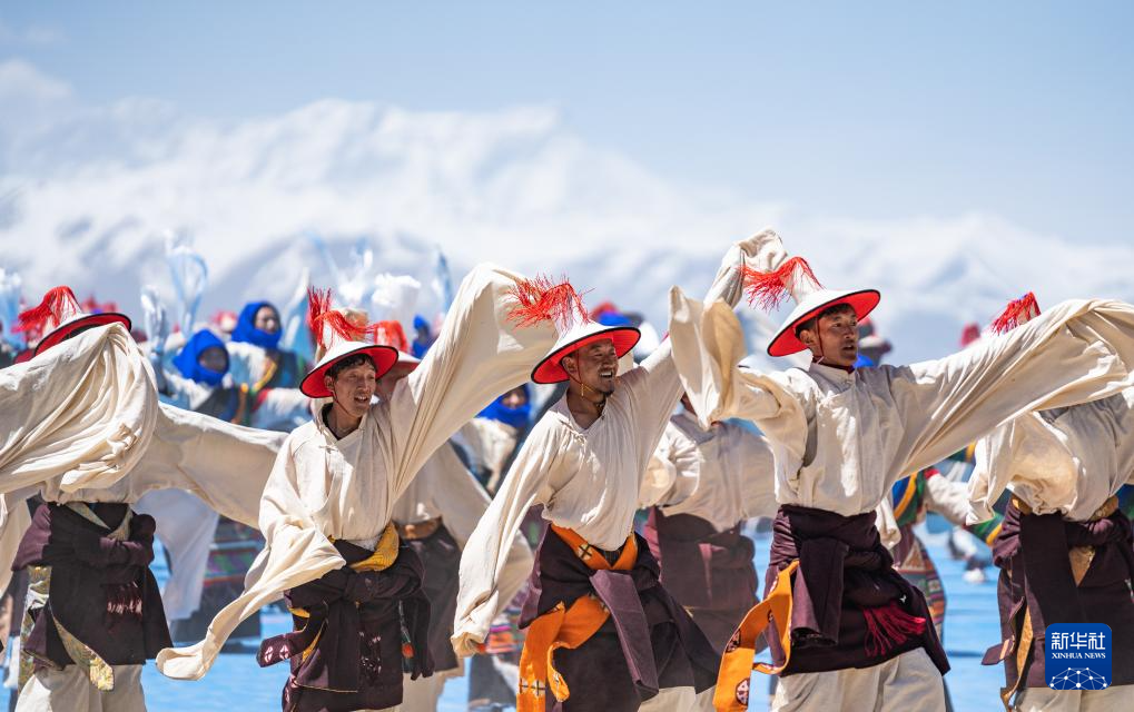 舞蹈演員正在納木錯開湖活動現(xiàn)場表演(5月19日攝)。