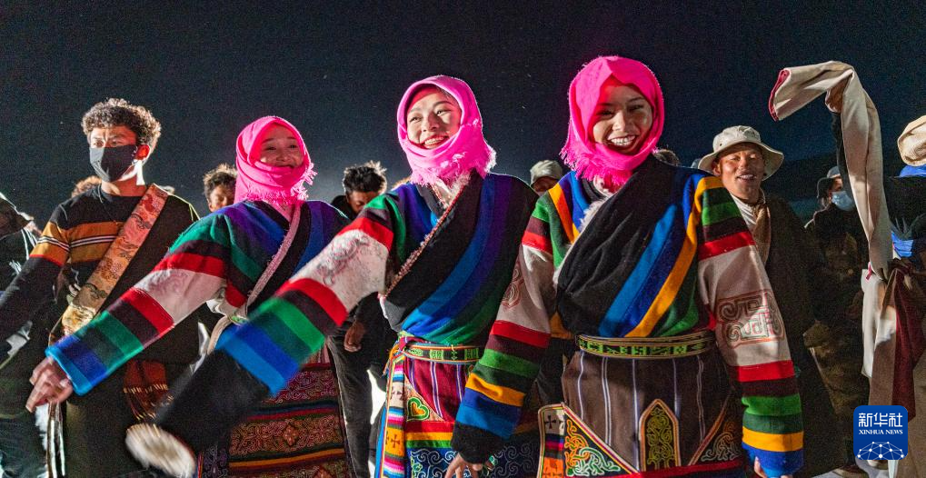 當?shù)厝罕娫诩{木錯開湖篝火晚會現(xiàn)場跳鍋莊(5月18日攝)。