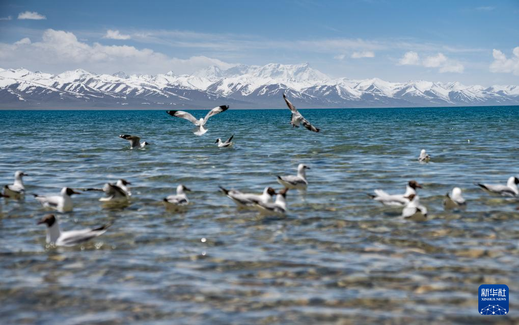 一群棕頭鷗在冰雪消融的納木錯湖面停留(5月19日攝)。