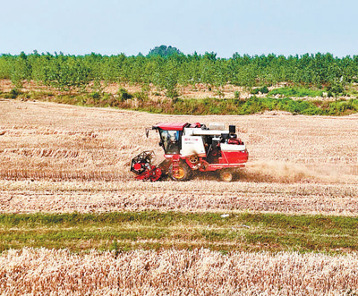 一片金黃的麥田里,撥禾輪轉(zhuǎn)動,麥芒飛揚,麥粒傾瀉而下……就在23日,蔡華從早忙到晚,沒敢停歇:“預(yù)報有雨,我得趕緊把客戶家的80多畝地收完?!碧烊谙聛?,他才把收割機(jī)停進(jìn)車棚,麥香味瞬間涌進(jìn)小院。累了一整天,剛吃完飯,蔡華又和妻子張秀蘭盤算起出發(fā)的行頭:對講機(jī)、收款二維碼……
