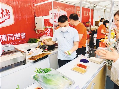 香港淄博同鄉(xiāng)會會長耿國華在淄博燒烤攤位制作特色美食。