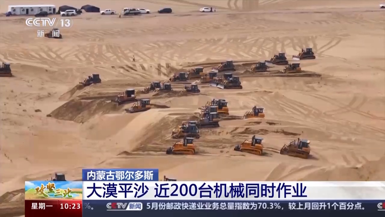 此刻,在我身后,近200臺(tái)推土機(jī)正在這片沙漠上來回穿行,他們要把這些高低起伏、連綿不斷的沙丘推平整了,再安裝光伏板。這么多推土機(jī)具體是如何作業(yè)的?技術(shù)人員告訴我們,因?yàn)榈匦蔚脑?,今天現(xiàn)場(chǎng)的推平作業(yè)大致分為兩個(gè)梯隊(duì):第一梯隊(duì)負(fù)責(zé)在沙丘的最上面,把頂部的沙子推下來;第二梯隊(duì)隨后,填平沙坑,平整現(xiàn)場(chǎng)。