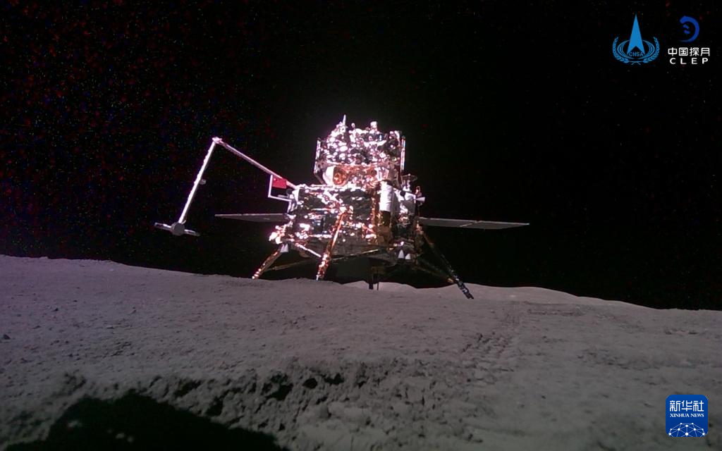 6月3日,嫦娥六號攜帶的“移動相機”自主移動后拍攝并回傳的著陸器和上升器合影。新華社發(fā)(國家航天局供圖)