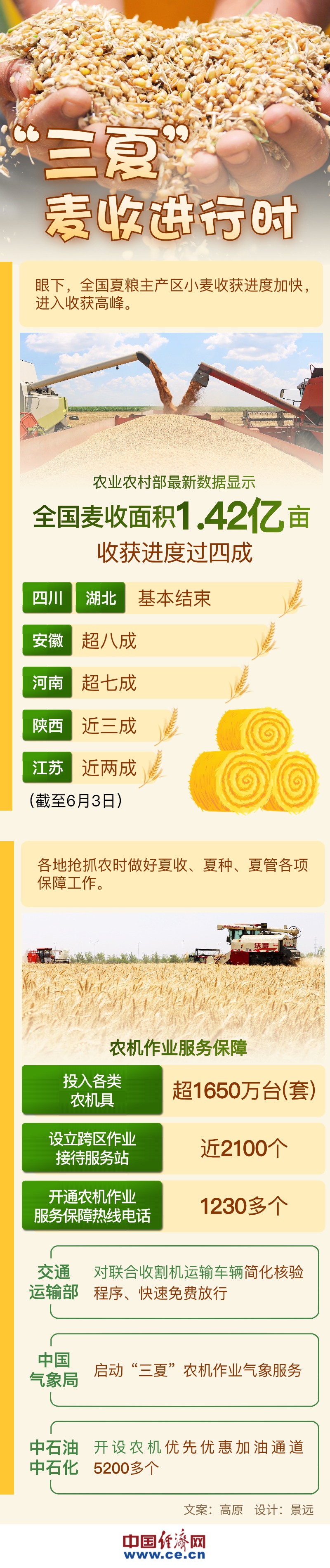 進入六月,全國“三夏”大規(guī)模小麥機收工作全面展開,收獲進度加快。據農業(yè)農村部最新數據顯示,截至6月3日,全國麥收面積1.42億畝,收獲進度過四成。