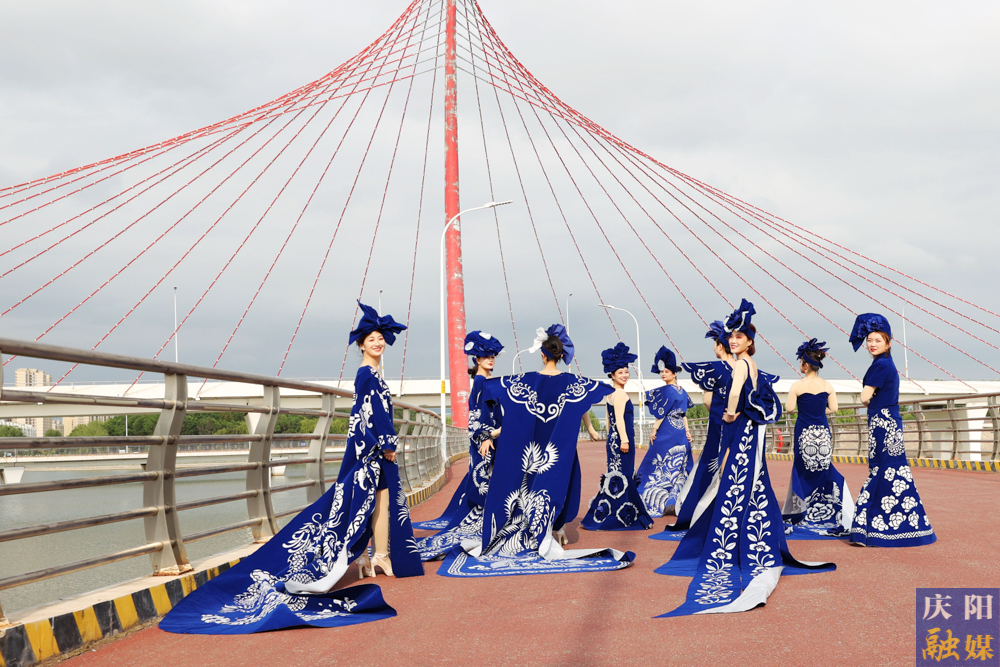 主播們在彩虹橋走秀,展示青花瓷系列服裝魅力。