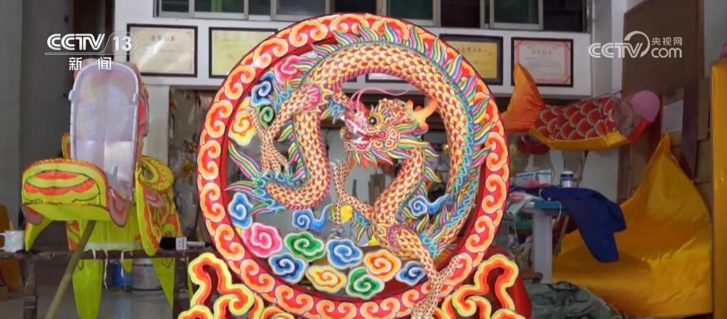 這件精美的龍燈彩扎藝術(shù)品,名叫《飛龍?jiān)谔臁?,是由非遺傳承人周合平歷時(shí)3個(gè)月完成的,馬上就要送往北京,收藏在中國(guó)非物質(zhì)文化遺產(chǎn)館。在這間扎龍工作室里,記者看到,大家正在趕制一批表演用的龍燈。