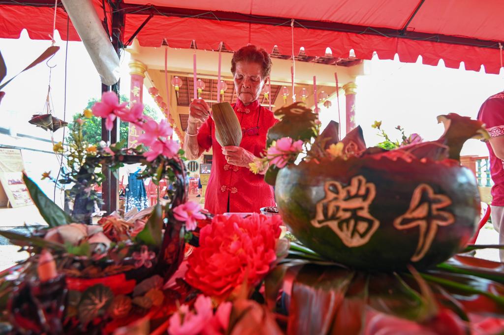 6月8日,一名女子在馬來西亞馬六甲市參加裹粽子比賽。當(dāng)日,馬來西亞馬六甲市舉辦“2024年慶端午”系列活動(dòng),人們以裹粽子、游龍舟等方式迎接端午節(jié)。新華社 張紋綜 攝