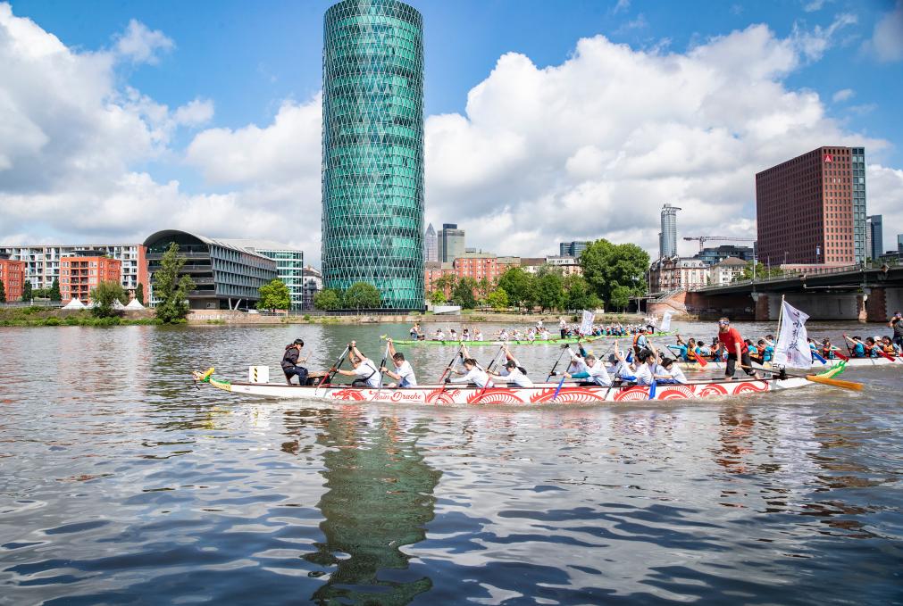 5月25日,在德國法蘭克福,龍舟隊(duì)伍在美因河上參加比賽。第一屆法蘭克福國際龍舟友誼賽暨2024年法蘭克福中國節(jié)開幕式當(dāng)日舉行,來自中國、德國、意大利等國的龍舟隊(duì)同臺(tái)競技,現(xiàn)場豐富多彩的中國文化展演活動(dòng)吸引大批觀眾參與。新華社記者 張帆 攝