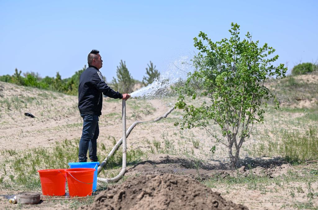 5月15日,在內(nèi)蒙古通遼市科左后旗甘旗卡鎮(zhèn)巴克要系統(tǒng)化治理項目區(qū),工作人員在給一棵楓樹澆水。新華社 連振 攝