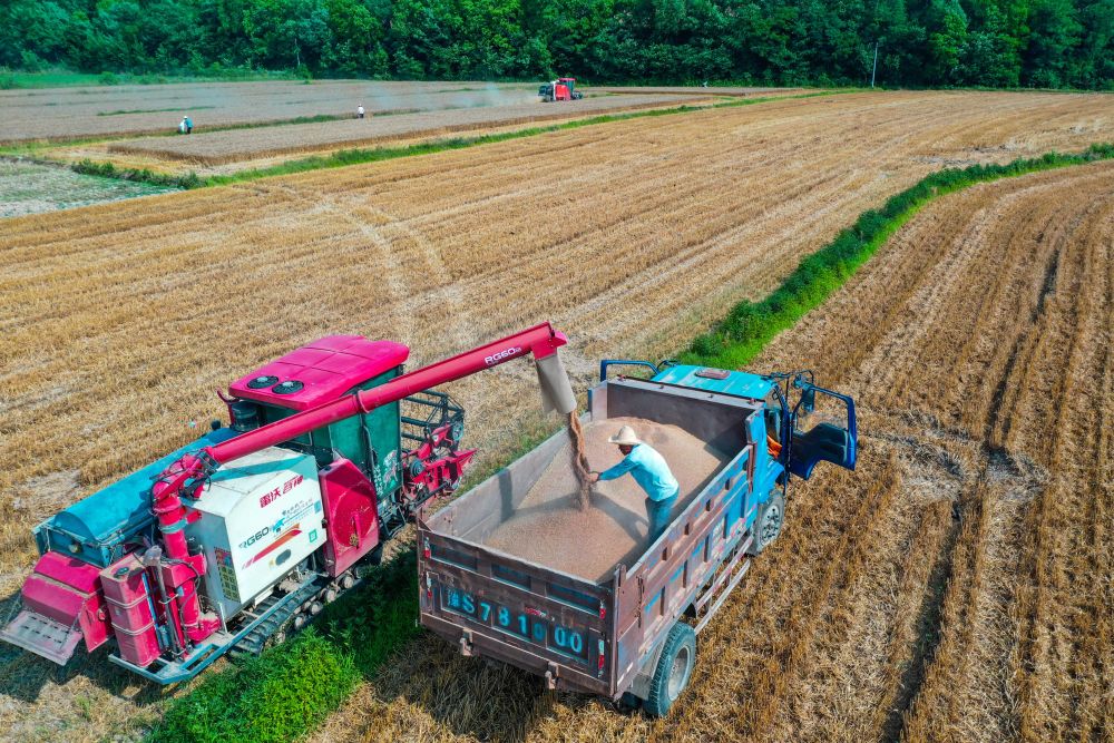 2024年6月1日,在河南省信陽市光山縣南向店鄉(xiāng)何畈村鑫磊合作社,社員將收獲的小麥裝車(無人機(jī)照片)。新華社發(fā)(謝萬柏?cái)z)